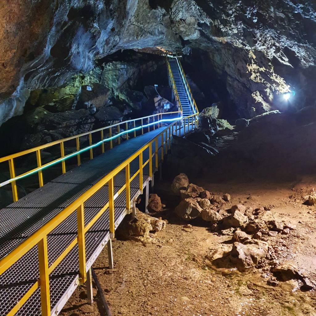 Tras mostrar las entradas nos indican que tenemos que cubrir obligatoriamente la cabeza con un casco. Aprovechamos para señalar que esta visita no es apta para todo el público: llegar desde la carretera hasta la entrada de la cueva no es fácil, y una vez dentro de la cueva hay muchos tramos en los que hay que ir en cuclillas, además de subir y bajar una buena cantidad de escalones. No se recomienda esta visita a personas con movilidad reducida o en silla de ruedas.