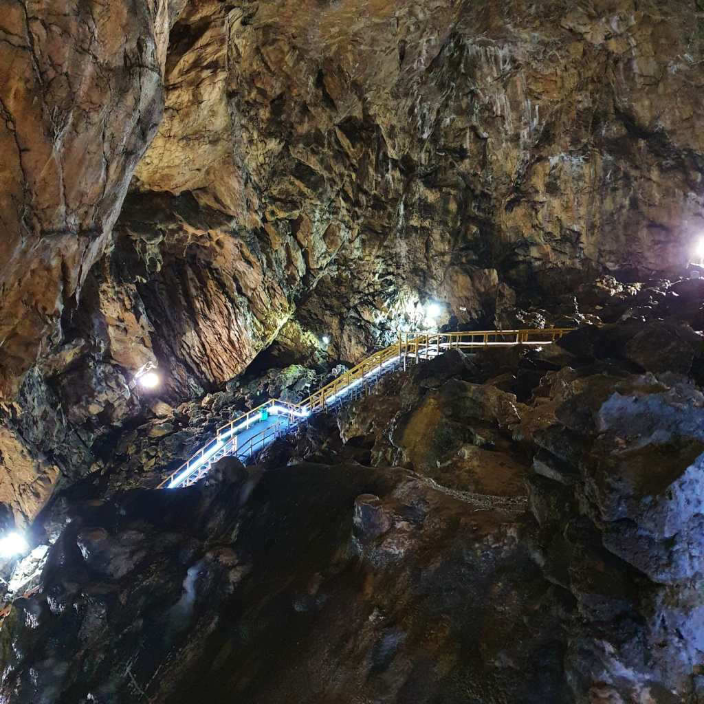 Llegados a nuestro destino, vemos junto a la carretera un Centro Cultural Misionero y el Monasterio de la Cueva Ialomita. Nos adentramos en el patio y unas flechas indican el camino hacia la cueva, que implica bajar hasta el río y subir unas rampas que nos dejan a la entrada de la cueva.
