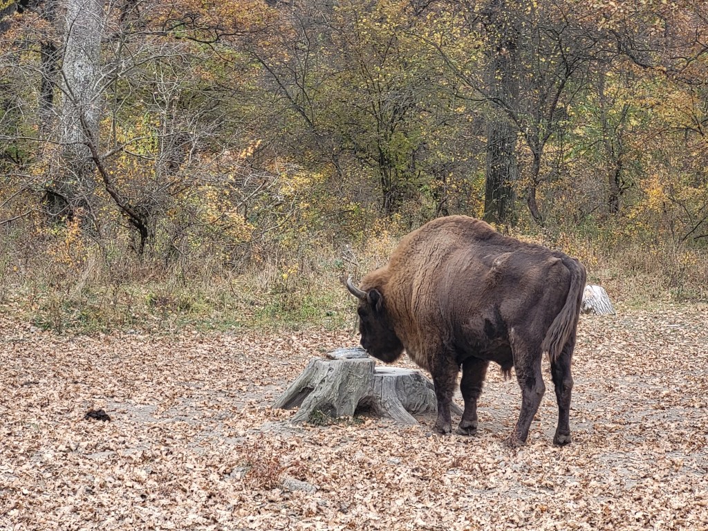 Venir a primera hora de la mañana fue todo un acierto: resulta que a esa hora es cuando se les entrega la comida a los bisontes. Nosotros hemos alcanzado a ver un grupo de unos 30 ejemplares de bisontes que se acercaban a comer junto a unos comederos de hormigón. Media hora más tarde, los bisontes se retiraban de nuevo hacia el bosque.