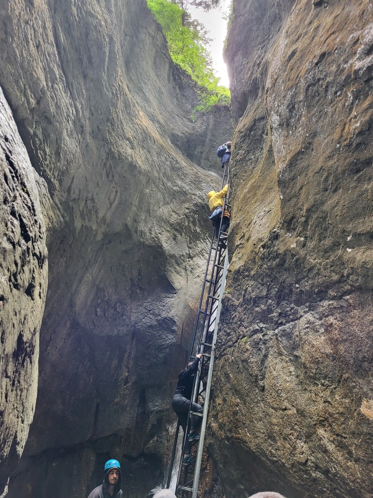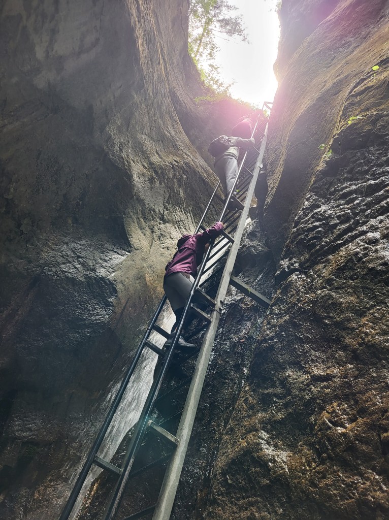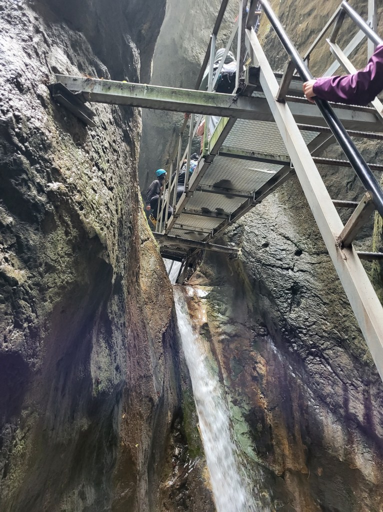 El acceso al cañón está controlado y se hace por grupos de un puñado de personas, para evitar el colapso de la estructura metálica, resistente pero bastante estrecha, que permite cruzar el cañón. La parte que tiene escaleras se concentra al principio del cañón. En total serán como unas 10 o 12 escaleras, contando también un par de ellas que son de bajada, y alguna que no es metálica, sino que está hecha en la roca.