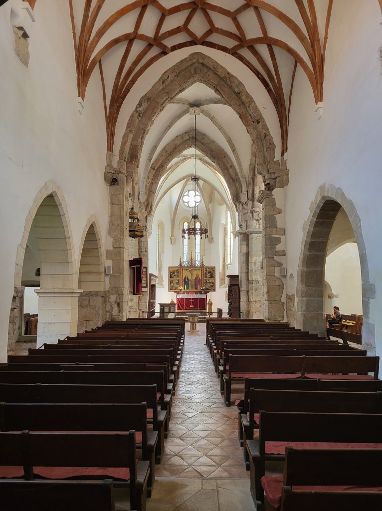 El interior de la iglesia de Prejmer es de estilo gótico y alberga numerosos elementos artísticos y religiosos valiosos, incluyendo pinturas murales, un altar tallado y uno de los órganos más antiguos de Rumanía.