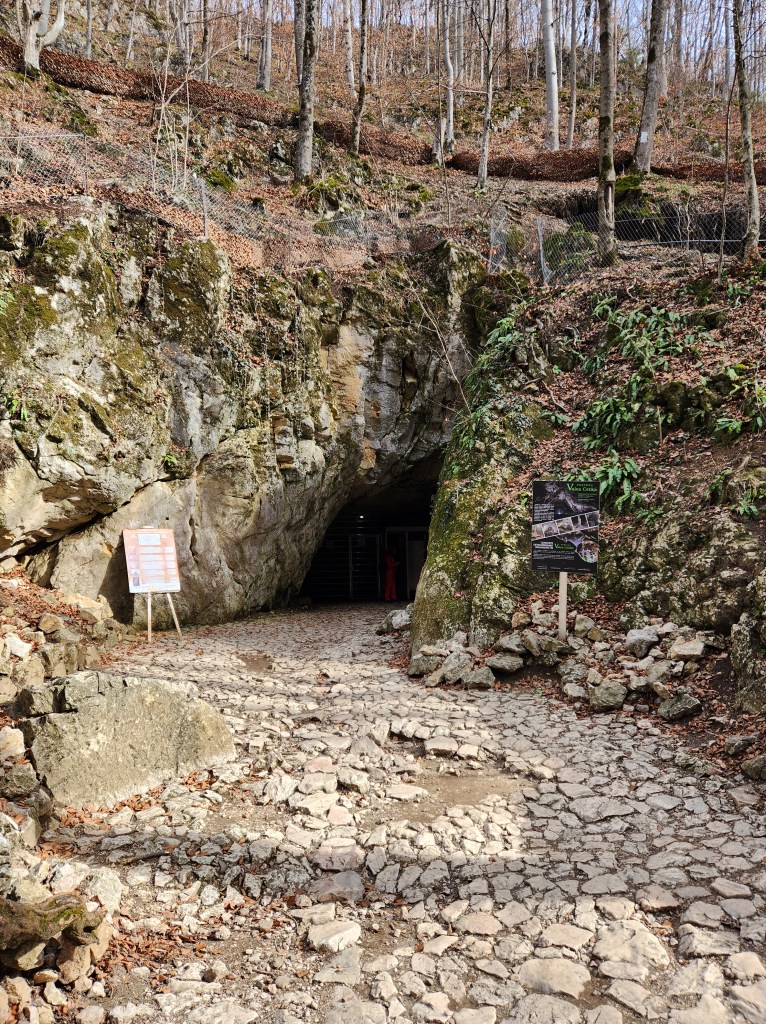 Tras subir unos diez minutos por unas rampas bastante inclinadas, que a veces dan la sensación de ser casi escalones de una escalera, vemos a mano izquierda la entrada de la gruta.