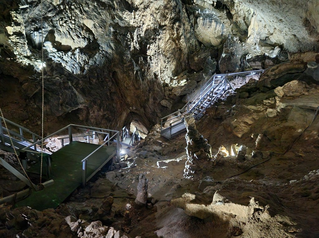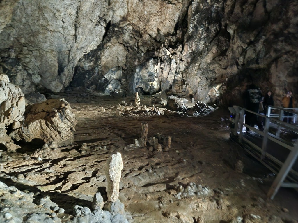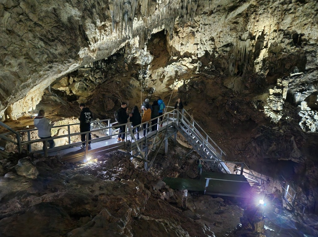 En el interior de la gruta, tras pasar por unos túneles más estrechos con estalactitas, estalagmitas y el goteo constante del agua, llegamos a una sala grande, que es el punto alto de esta visita.