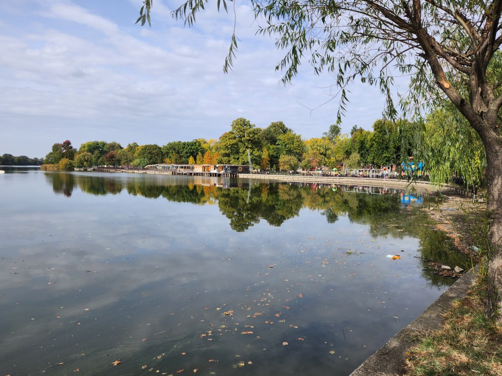El lago domina la parte este del parque, y una de las fachadas del palacio se encuentra a escasos metros de distancia de su orilla, que incluye un pequeño embarcadero.