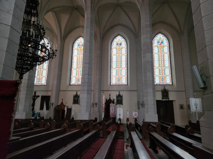 El techo de la iglesia es abovedado, con enormes columnas y arcos decorativos.